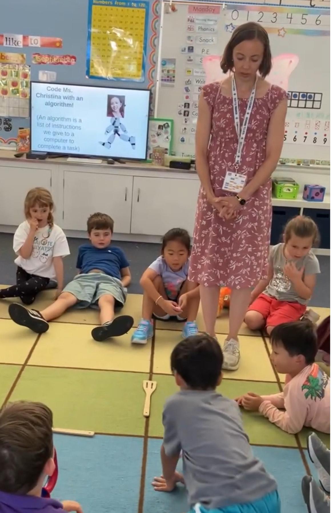 In computer science, students in K–2 began the year learning what makes a computer a computer and imagining apps they might create in the future. They practiced writing algorithms (instructions for a computer to follow) and explored the concepts of sequencing—putting steps in the correct order—and loops—repeating instructions efficiently. They first learned these foundational concepts through hands-on activities like coding a “human robot” (Ms. Christina!), creating secret handshakes, and following dance patterns that used loops to repeat steps. Then, they applied their learning on the computer by writing code to help characters navigate obstacles and solve problems.