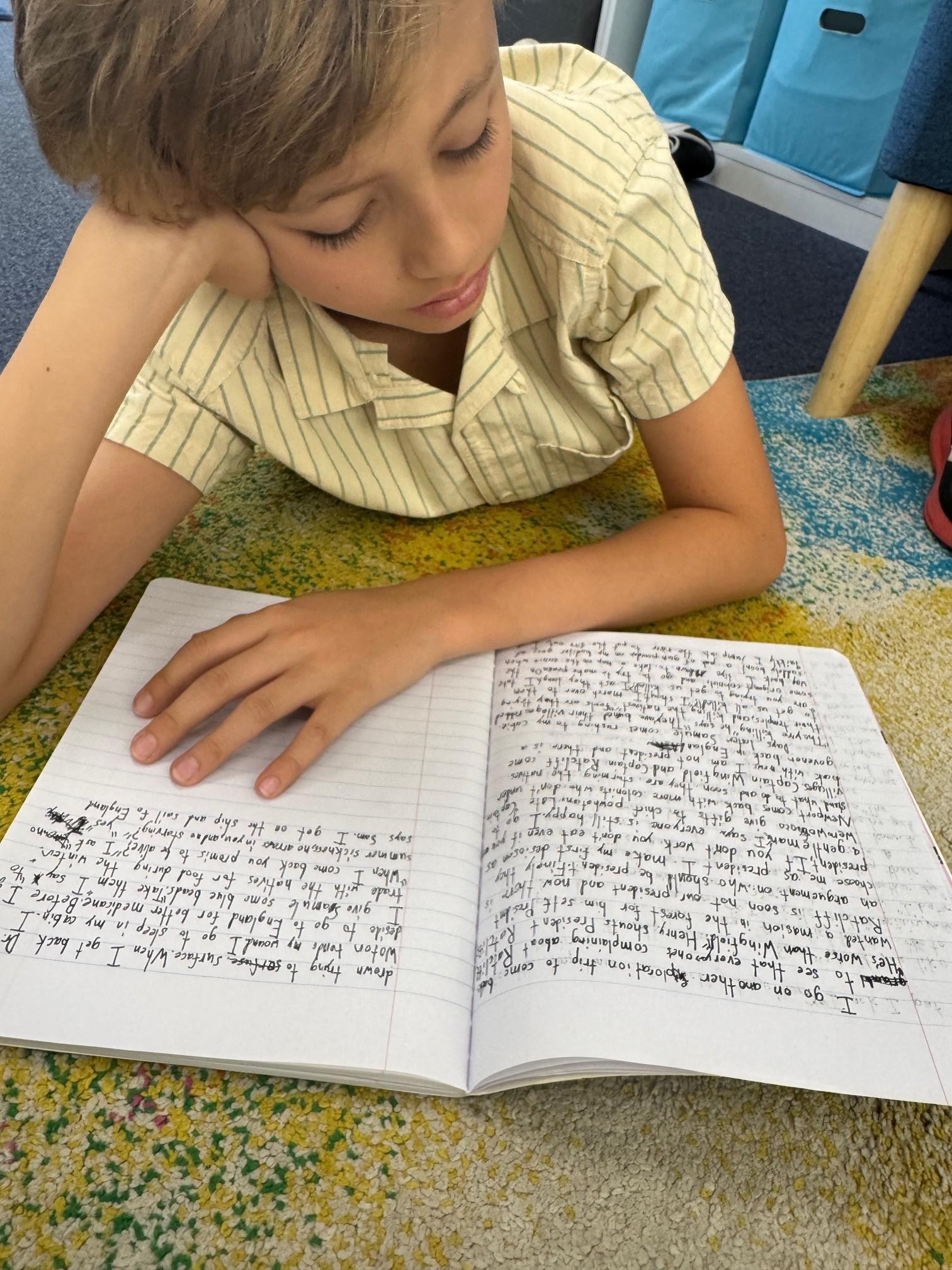 This summer, our fifth graders dove into history through the novel Blood on the River by Elisa Carbone. After reading this engaging story about the Jamestown settlement, for our first narrative essay of the school year, students imagined themselves as one of the main characters—such as Samuel Collier or Captain John Smith—and wrote a five-paragraph Character Narrative Essay retelling important events from the novel through that character’s perspective. They used a variety of writing crafts, such as vivid description, dialogue, and inner thoughts, to bring the historical setting and challenges of early Jamestown to life. Throughout the editing and revision process, students strengthened their word choice, organization, and voice. The final essays showcase not only their understanding of Blood on the River but also their creativity and growth as thoughtful, expressive writers.